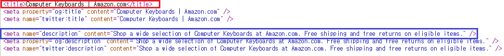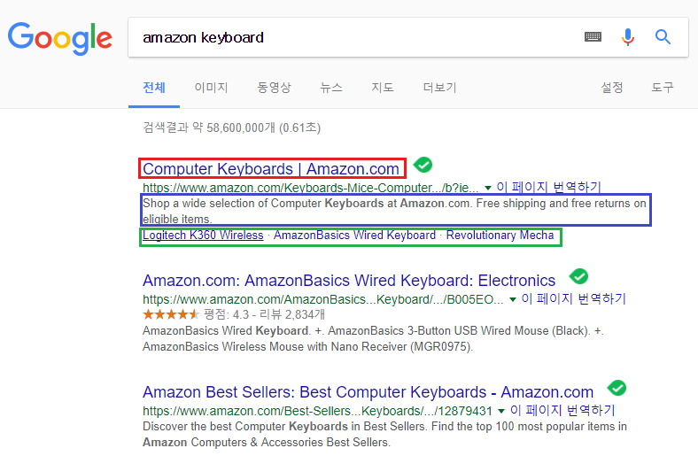 빨간색 부분이 구글 검색 시 노출되는 타이틀 부분입니다. 해당 페이지의 소스보기를 하면 <title> 태그 안의 내용과 동일합니다.파란색 부분은 해당 페이지의 설명으로 구글 검색결과 페이지에서 해당 페이지에 대한 Preview를 보여줍니다.